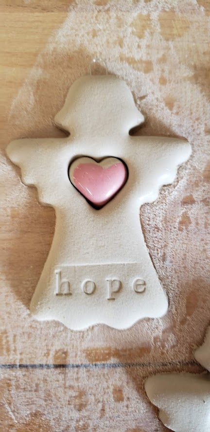 March Update: Of course then in March, Covid 19 hit with a vengence and everything shut down. I could not go to Sterling House to make hearts or angels, but fortunately, I had won a grant in the past for the purchase of a small portable rolling table. So when I had learned that Sterling House was going to be shutting down, I went in and grabbed the small rolling table, one box of clay, and everything I would need to continue to make angels at home.